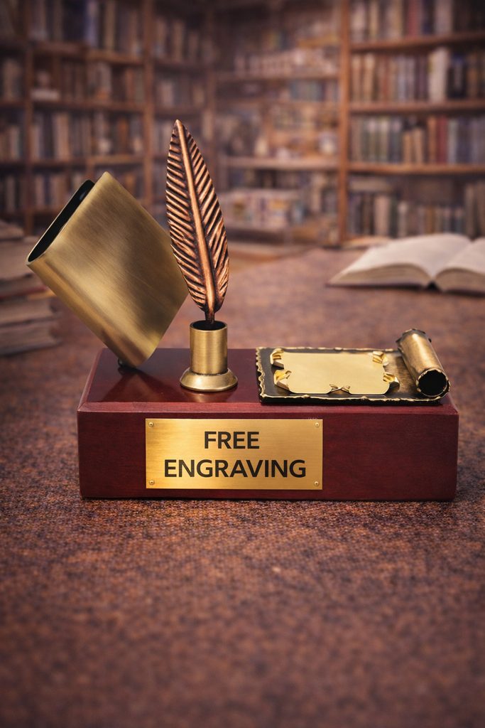 The Twain Literature Trophy is an exclusive handmade metal award. It is mounted onto a high quality polished wooden base. The award is part of an exclusive collection of awards that are handmade in Barcelona, Spain. Each trophy is hand crafted from high quality metals, including brass, copper, nickel, pewter and steel and are set upon either wooden or marble bases.