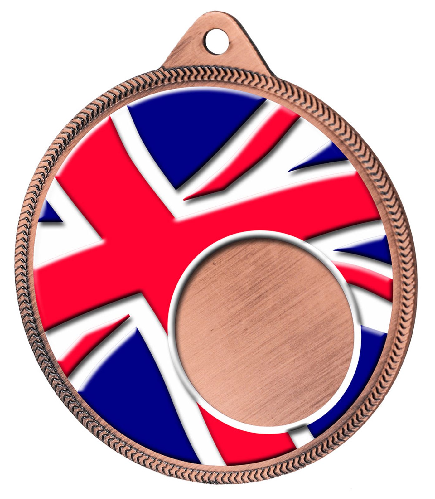 The Union Jack Flag Logo Insert Bronze Medal is exclusive to Trophy Monster. Give out medals to remember with this uniquely designed metal 2 1/8" medal. The medal has been printed using the latest 3D texture coating technology making the medal come alive with a vibrant raised full color print.