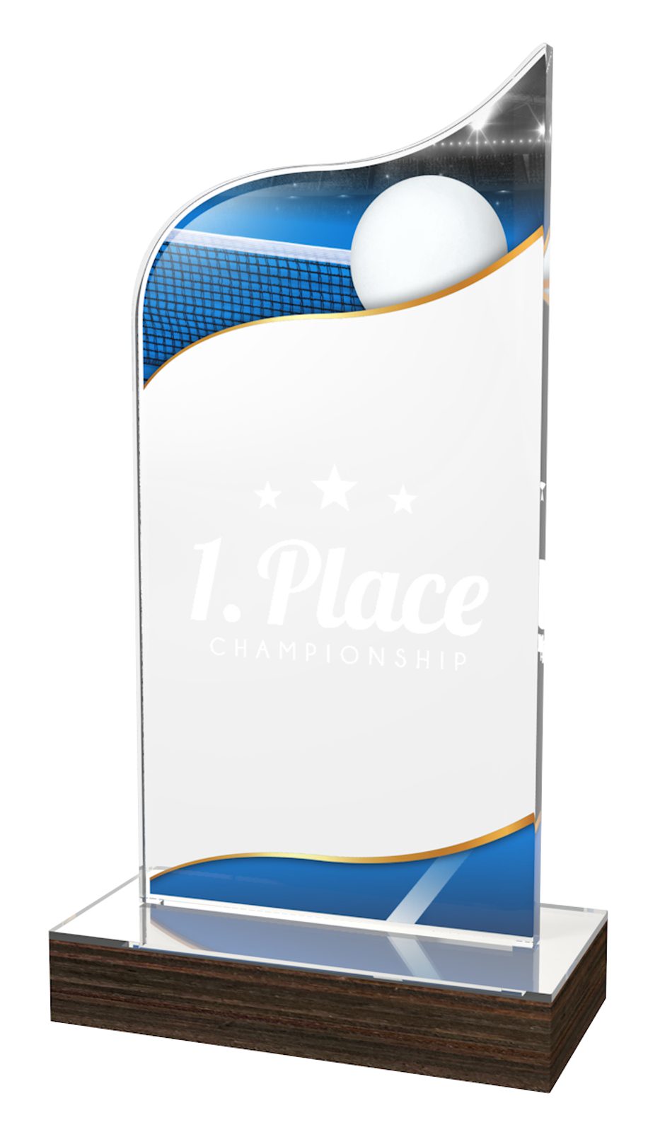 A stunning new in-house design trophy blending acrylic with real wood.  The trophy is made using 5/16" thick premium acrylic mounted on a 4 ply birchwood base. This is completed by fitting an acrylic mirror top to the base leaving a unique and expertly finished award.