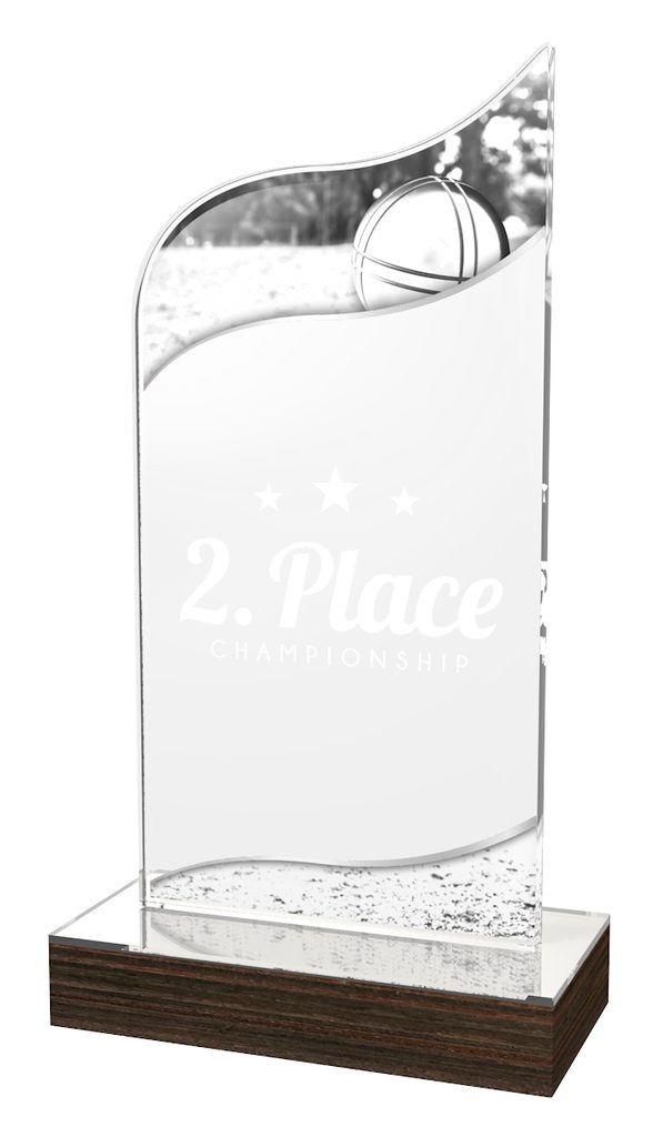 A stunning new in-house design trophy blending acrylic with real wood.  The trophy is made using 5/16" thick premium acrylic mounted on a 4 ply birchwood base. This is completed by fitting an acrylic mirror top to the base leaving a unique and expertly finished award.