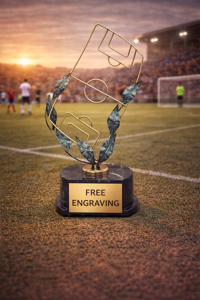 The Utrera Soccer ball all Trophy is an exclusive handmade design displaying a tall gold metal Soccer ball pitch sitting on a green laurel. This is then mounted onto a marble effect wooden base. The award is part of an exclusive collection of awards that are handmade in Barcelona, Spain. Each trophy is hand crafted from high quality metals, including brass, copper, nickel, pewter and steel and are set upon either wooden or marble bases. The award also comes with a FREE engraved self adhesive plate with text of your choice. As this trophy is made to order, please allow 10 working days for import and delivery.