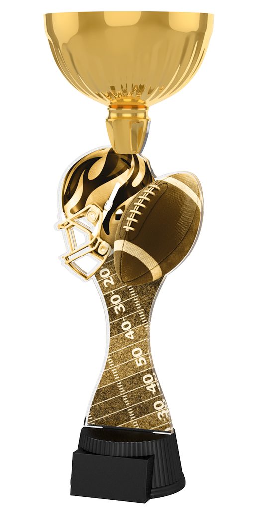 The Vancouver Classic American Football Gold Cup Trophy will be the centerpiece in any presentation. This trophy features a high quality sepia-style print on the reverse side of 1/4" acrylic, with a gold metal cup, all mounted on a circular and weighted black PVC base.