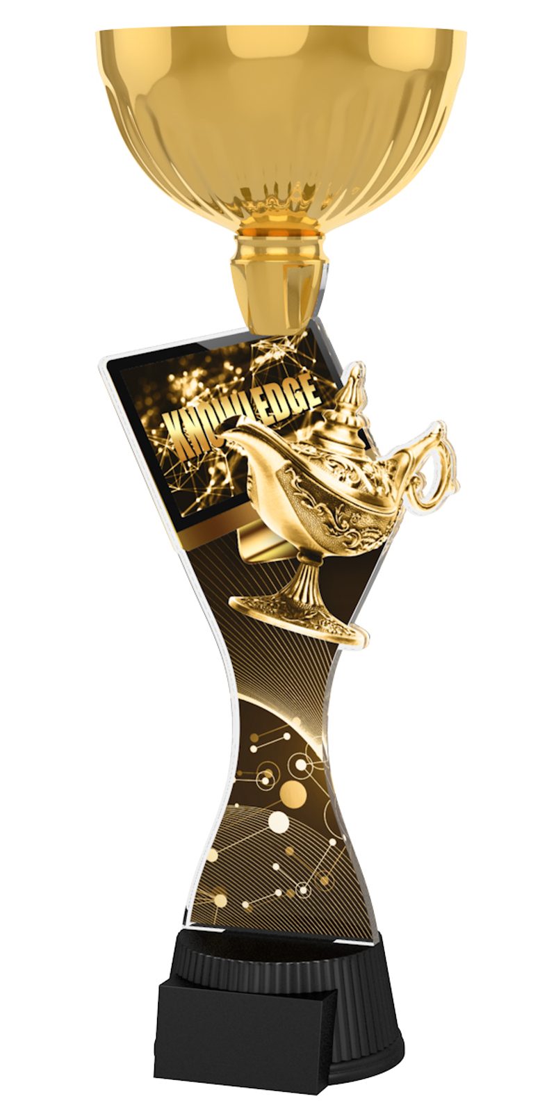 The Vancouver Classic Magic Lamp Quiz Gold Cup Trophy will be the centerpiece in any presentation. This trophy features a high quality sepia-style print on the reverse side of 1/4" acrylic, with a gold metal cup, all mounted on a circular and weighted black PVC base.