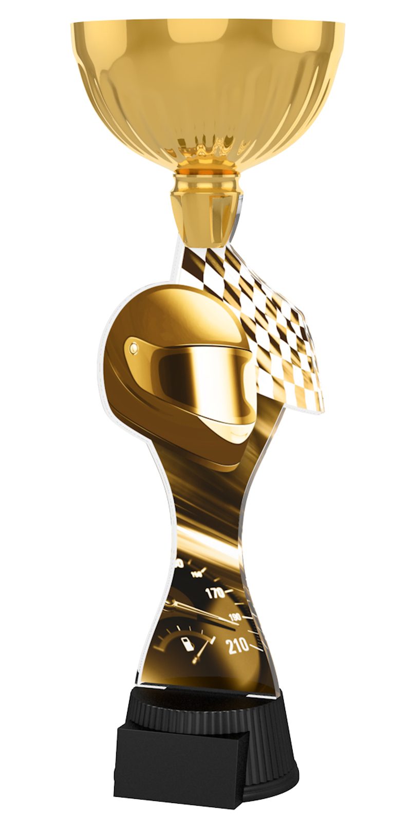 The Vancouver Classic Motorsports Gold Cup Trophy will be the centerpiece in any presentation. This trophy features a high quality sepia-style print on the reverse side of 1/4" acrylic, with a gold metal cup, all mounted on a circular and weighted black PVC base.