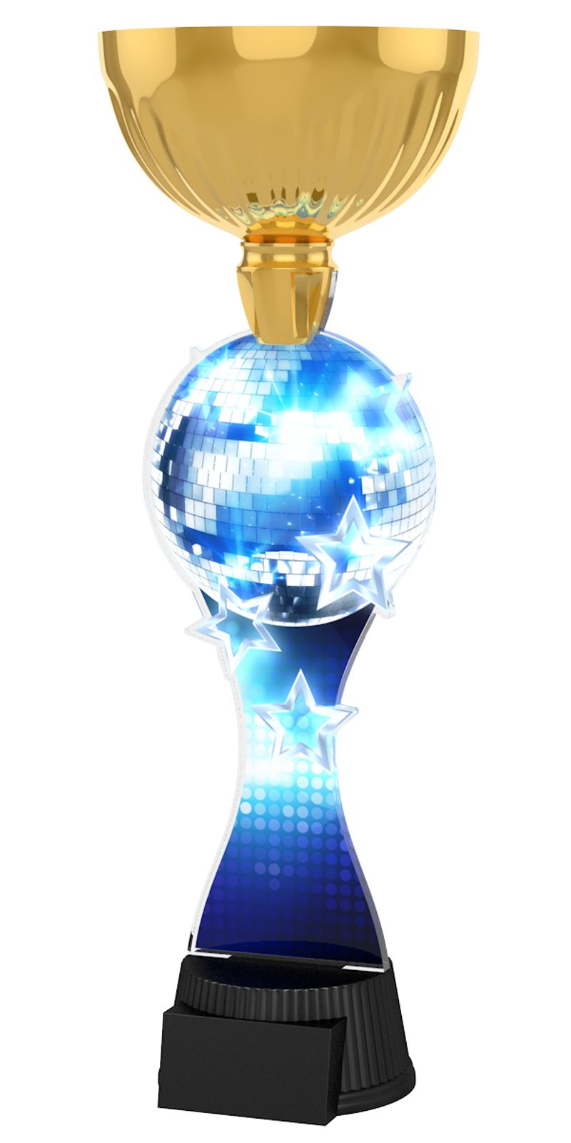 The Vancouver Disco Ball Gold Cup Trophy will be the centerpiece in any presentation. This trophy features a high quality full color print on the reverse side of 1/4" acrylic, with a gold metal cup, all mounted on a circular and weighted black PVC base.