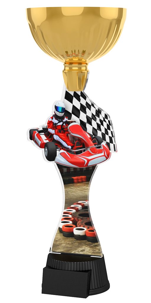 The Vancouver Go Kart Gold Cup Trophy will be the centerpiece in any presentation. This trophy features a high quality full color print on the reverse side of 1/4" acrylic, with a gold metal cup, all mounted on a circular and weighted black PVC base.