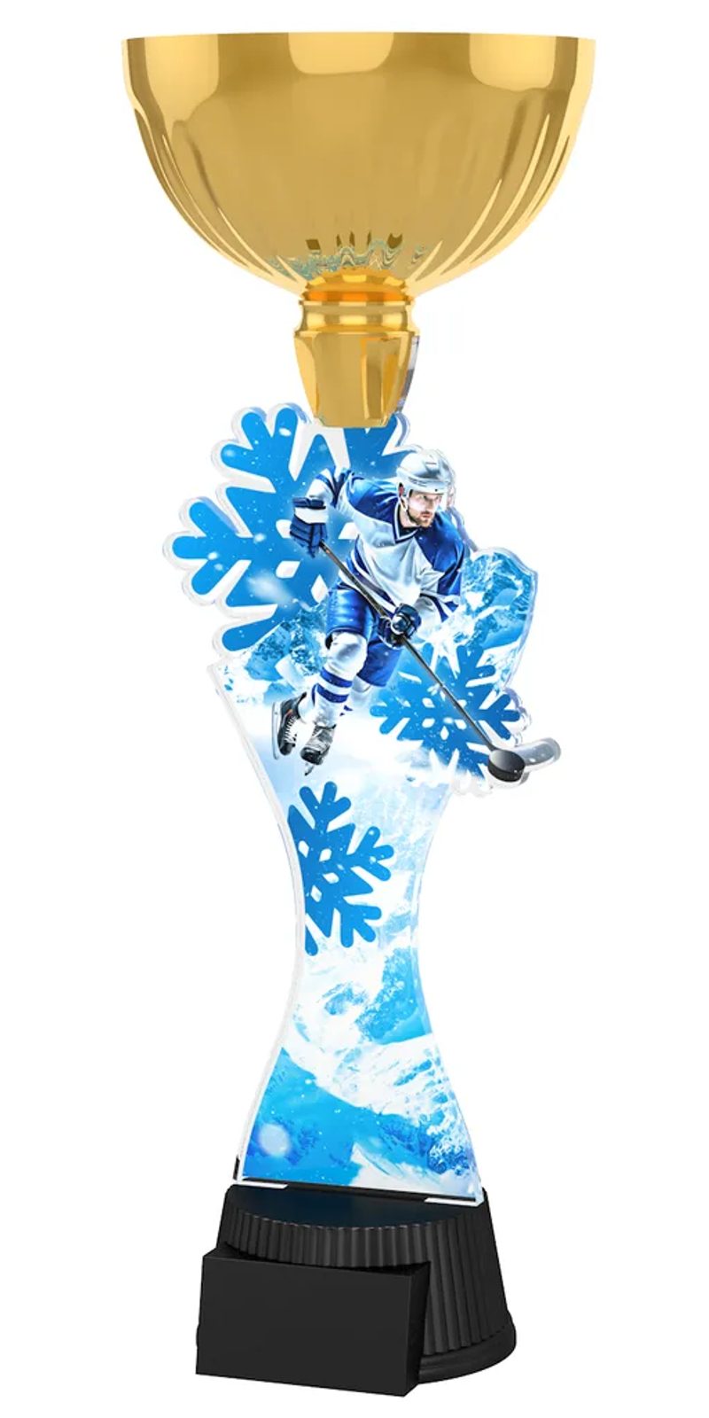 The Vancouver Ice Hockey Gold Cup Trophy will be the centerpiece in any presentation. This trophy features a high quality full color print on the reverse side of 1/4” acrylic, with a silver metal cup, all mounted on a circular and weighted black PVC base.