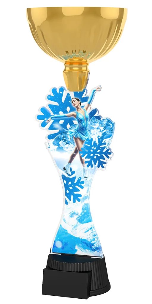 The Vancouver Ice Skating Gold Cup Trophy will be the centerpiece in any presentation. This trophy features a high quality full color print on the reverse side of 1/4” acrylic, with a silver metal cup, all mounted on a circular and weighted black PVC base.