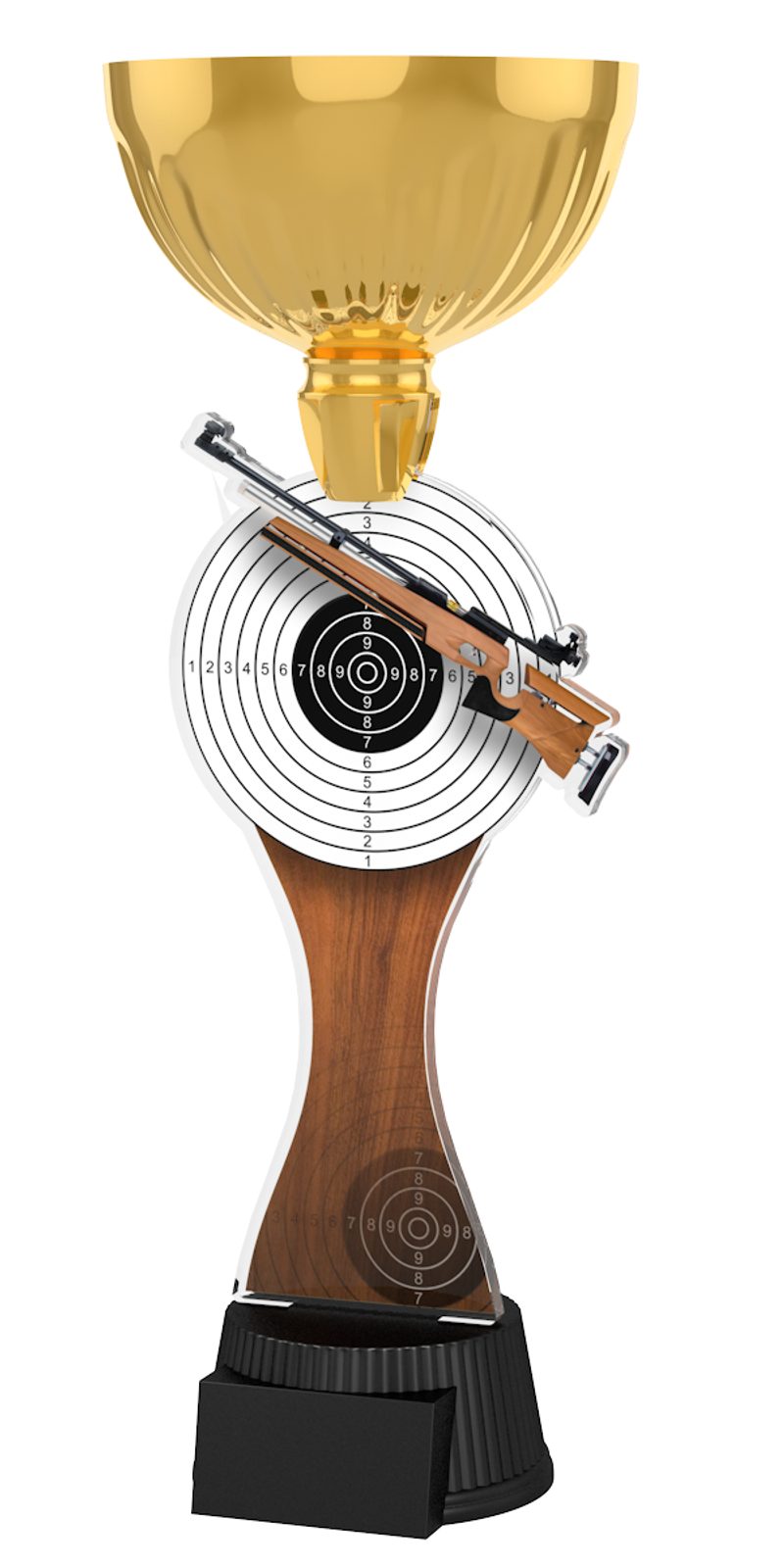 The Vancouver Rifle Shooting Gold Cup Trophy will be the centerpiece in any presentation. This trophy features a high quality full color print on the reverse side of 1/4" acrylic, with a gold metal cup, all mounted on a circular and weighted black PVC base.