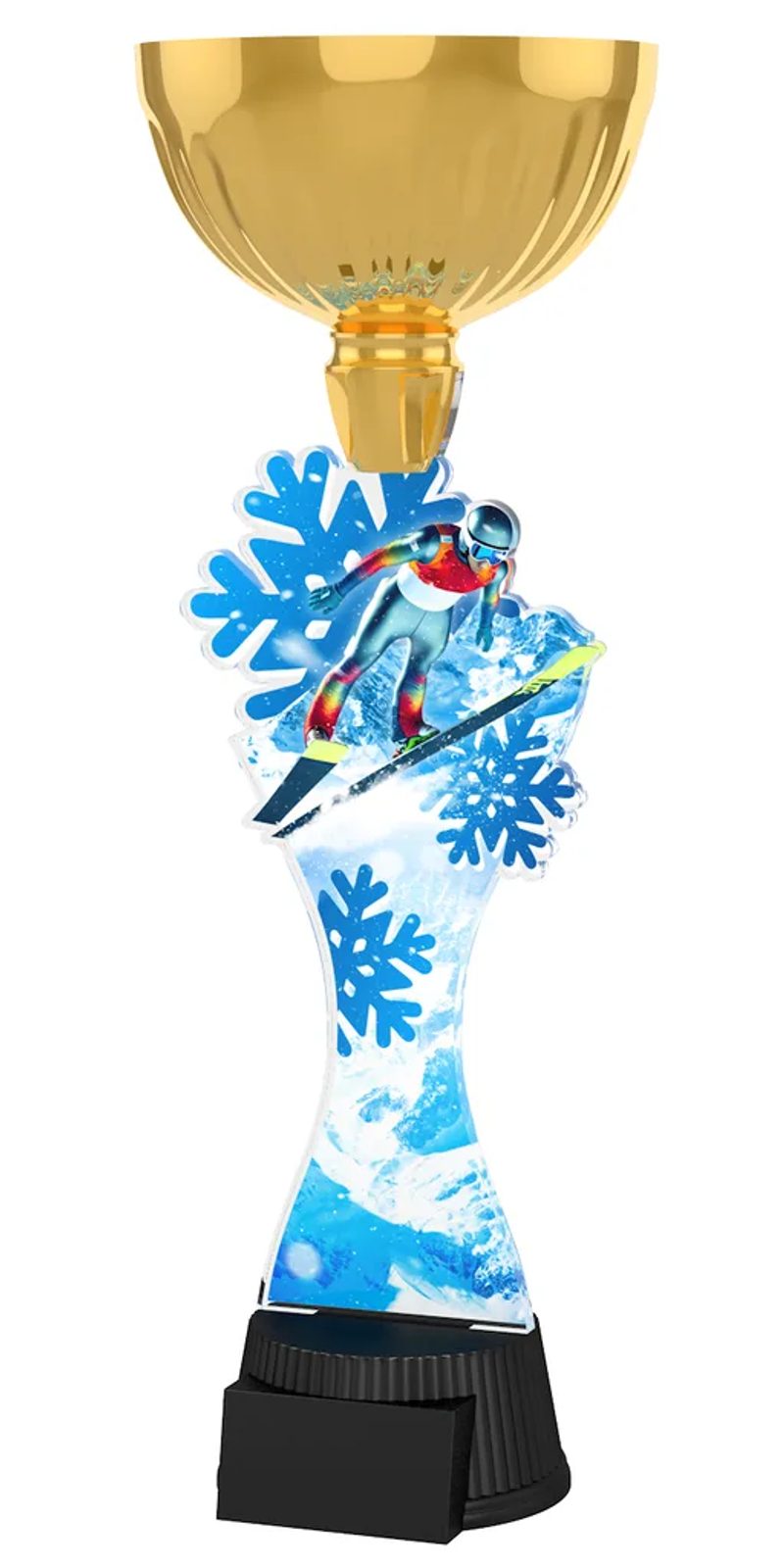 The Vancouver Ski Jumping Gold Cup Trophy will be the centerpiece in any presentation. This trophy features a high quality full color print on the reverse side of 1/4” acrylic, with a silver metal cup, all mounted on a circular and weighted black PVC base.