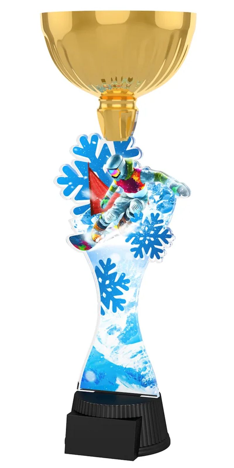 The Vancouver Snowboarding Gold Cup Trophy will be the centerpiece in any presentation. This trophy features a high quality full color print on the reverse side of 1/4” acrylic, with a silver metal cup, all mounted on a circular and weighted black PVC base.
