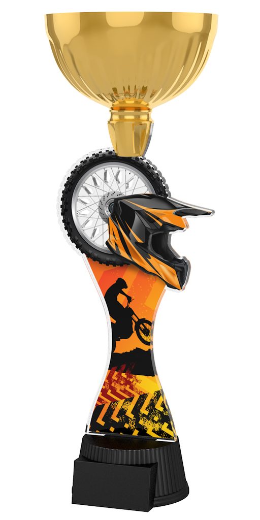 The Vancouver Speedway Gold Cup Trophy will be the centerpiece in any presentation. This trophy features a high quality full color print on the reverse side of 1/4" acrylic, with a gold metal cup, all mounted on a circular and weighted black PVC base.