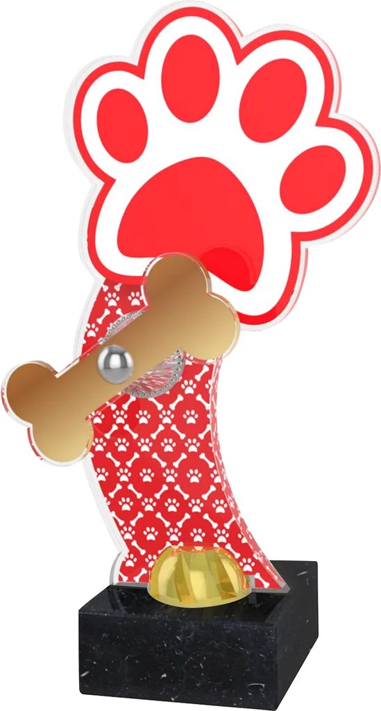 The Vienna Dog Show Red Paw Trophy is part of a new and exciting range of awards. Cut to shape this trophy comes to life with a high quality full color reverse print on the 3/8" thick acrylic. The front bone is a separate piece that is screwed on the front which makes this item truly unique. Just above the base sits a riser. Please select which color riser you like from gold, silver or bronze.