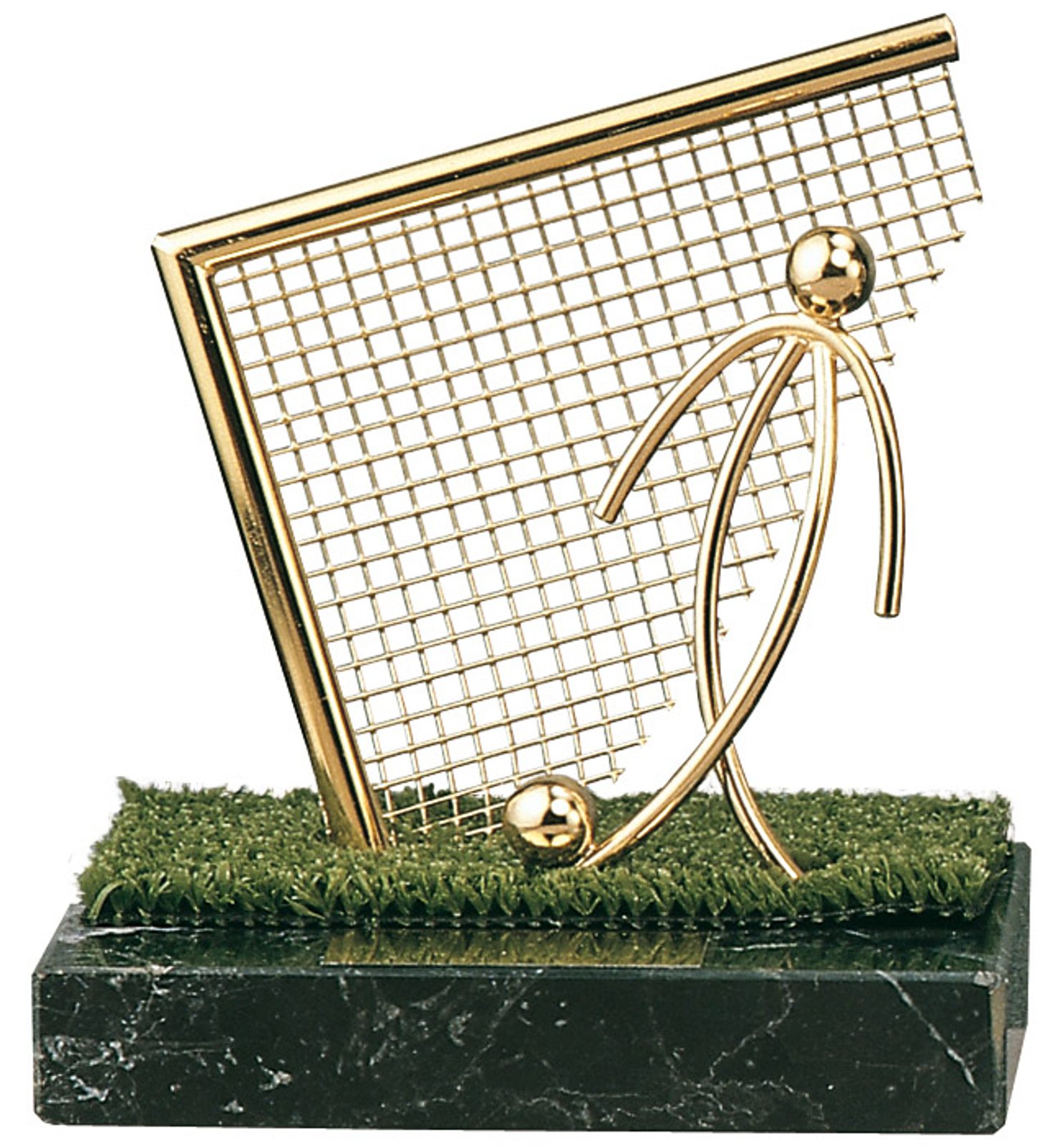 The Vigo Soccer  Goalscorer Trophy is an exclusive handmade metal award displaying a stunning artistic gold player scoring a goal. The trophy sits on a cut of astroturf and is then is then mounted onto a high quality black marble base.