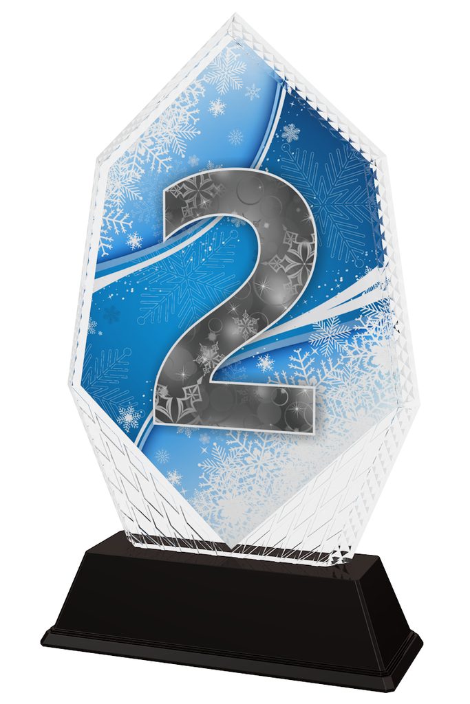 The Whistler 2nd Place Winter Sports Trophy has been developed using a special patterned 1/3" acrylic mounted on a black PVC base. The feature of the Whistler range is its unique winter-blue based high quality print.