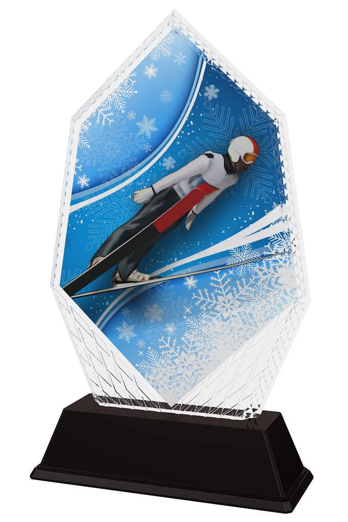 The Whistler Ski Jump Trophy has been developed using a special patterned 8mm acrylic mounted on a black PVC base. The feature of the Whistler range is its unique winter-blue based high quality print.