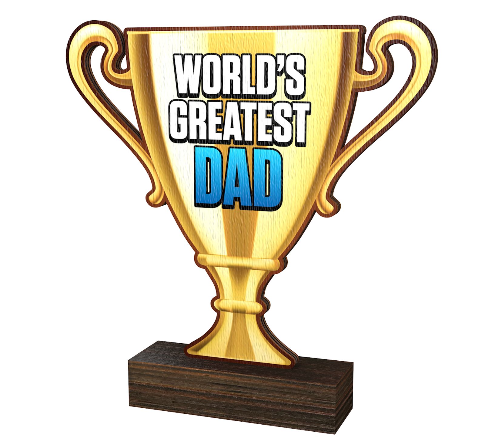 The Worlds Greatest Dad Trophy Cup is a brand new eco friendly award made from 5/16" thick natural birch plywood, mounted on a thick wooden rectangular base. A sustainable product that is part of a collection designed and manufactured in our own factory. Not only for the environmentally conscious, this trophy will be a standout gift.
